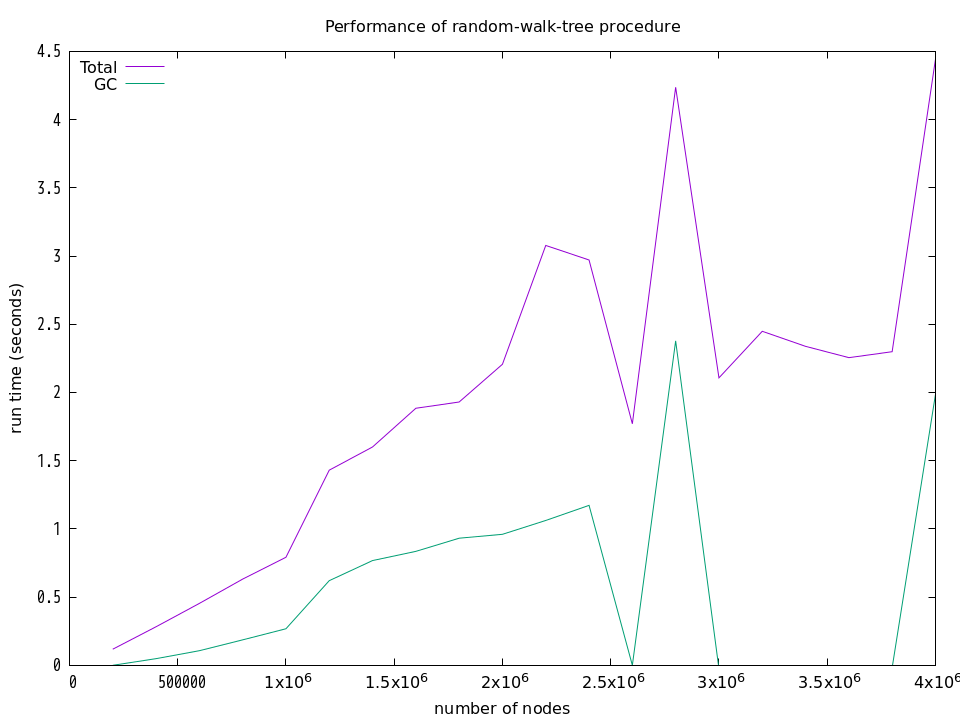 上記の結果は,何回も計測した結果の中から「きれい」な結果を選んだものです.実際には,下図に示すように,GCの気まぐれな動作のために計算時間は大きく変動してしまいます.下図は,それぞれの手続きに関して,20万頂点から始めて400万頂点まで,20万頂点ごとに実行時間とGCの時間を計測した結果を示しています.それらの計測にはGuileの (statprof) モジュールが提供する statprof 手続きを使用しています.